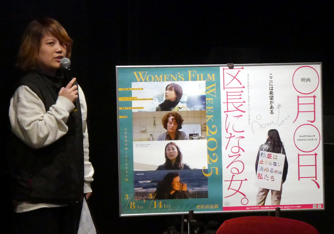 「Women’s Film Week 2025」『映画⚪︎月⚪︎日、区長になる女。』3/9(日)の上映後、ペヤンヌマキ監督とアルテイシアさんのトークイベントを開催しました。トークでは国際女性デーに合わせた特集「Women’s Film Week 2025」の中で今回再上映をさせていただいたことについてペヤンヌマキ監督にお話しをお聞きしました。ペヤンヌマキ監督は元々は映画監督ではなく、劇作家やテレビドラマの脚本家として活動されており、その時から女性を描いた作品を作ることが多かったそうですが、今回の『区長になる女。』に関しては女性を描こうとして撮ったわけではなく、ご自身が住む杉並の一市民として自分の生活を守りたいと思って撮り始めたものが、たまたま活動的で魅力的な同世代の女性たちと出会う形になったそうです。「たまたまなのか必然的なのかわからないが、結果女性を描く映画になった」「上映が始まってからも、自主上映会を主催してくださるのは女性の方が多い」ともペヤンヌマキ監督からのお話しもありました。「4回観て、4回泣いた!」と熱いコメントを寄せられたアルテイシアさんからペヤンヌマキ監督に質問する形で、岸本さんが区長になった現在の杉並区の話題にもなりました。話はアルテイシアさんが定期的に開催されている「東灘区ジェンダーしゃべり場」の話題に及び、「ジェンダーしゃべり場に参加される人は”モヤモヤ”している人が多い。」というアルテイシアさんの言葉に「常に何かの当事者のはずなのにそれに気づかないだけ。自分が日々モヤモヤしていたことが政治につながっているということが気づけるきっかけがあるといい」とペヤンヌマキ監督ご自身が本作を作るきっかけになったことを踏まえながらお話しされていました。