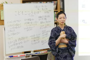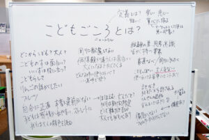 小さなお子さんも参加してくださり、難題に挑む参加者のみなさんが益田先生から託されたぬいぐるみを手に、自分の考えを語り、問いを立てた人にわからないところは聞き、すべての人が考えを述べ終えるころには、「こどもごころ」という言葉に対する様々な解釈や想い、使うシチュエーションの違いが存在することも浮かび上がりました。益田先生のファシリテーションにより、安心して意見を言える場が醸成されていくプロセスも味わえたのではないでしょうか。