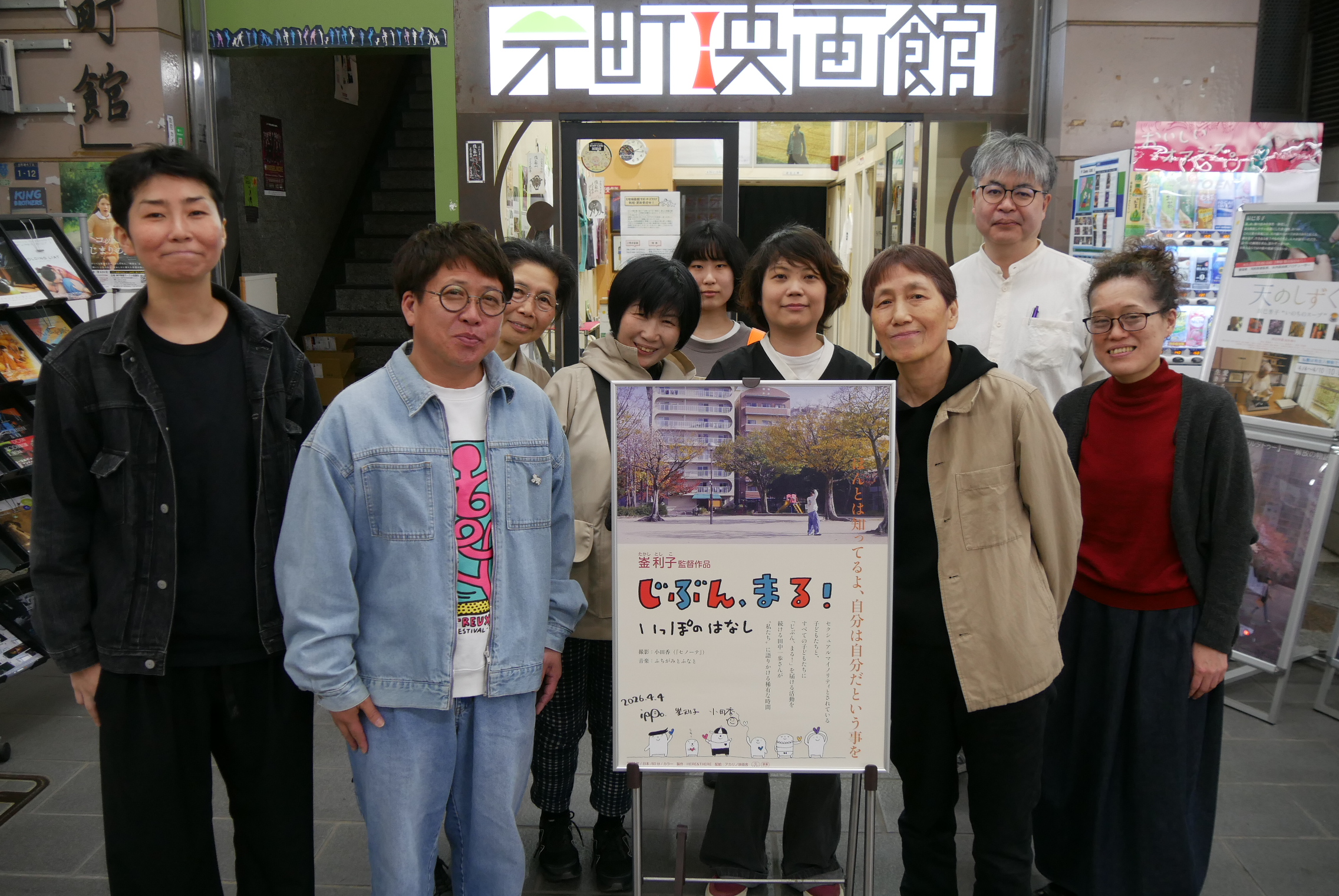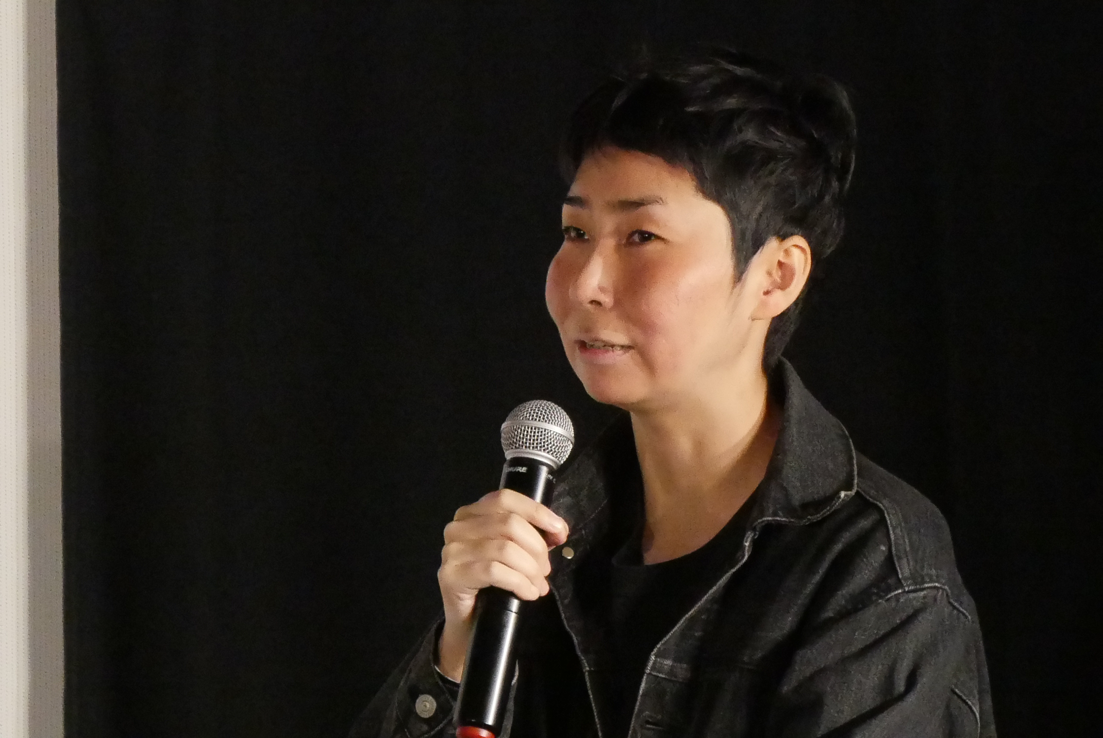 4/4(土)『じぶん、まる!いっぽのはなし』の上映後、崟利子監督、田中一歩さん、本作撮影の小田香さんの舞台挨拶を開催しました。2年前に完成し、崟監督にとっては初めての一般劇場公開作となる本作。被写体である田中一歩さんは上映のたびに本作を観ているそうで、この日もお客様と一緒に映画を鑑賞し「自分の言葉や表情を見て、観る時々で感じることは違います」とこの日見られた感想を最初にお話しくださいました。撮影を担当された小田さんは「撮影をしているときはそんなに感じなかったが、映画を見るたびに一歩さんがお話しされづらそうにしているなとか、話すと痛みが出たりとかがあるんだなと思いながら観てたいた。撮影時は一歩さんと崟監督の信頼関係もあって優しい雰囲気があった」と撮影時のことや、映画を見た時の印象をお話しいただきました。崟監督からは「一歩さんとは昔からの友人で、一歩さんのことを映画として残したいという気持ちがずっとあってタイミングが重なり映画を作ることになった」と制作の経緯のお話に。崟監督は今まで1人で、個人映画や実験映画と呼ばれるジャンルのものを作り続けてきた映像作家で、本作が初めてスタッフを入れて制作した映画となったそうです。実は小田さんに一歩さんの映画を監督として作らないか、と最初に相談してもいたそうで、その話をもらった小田さんは「崟監督が絶対に撮ったほうがいい」と返答し、それでもこの映画に関わってほしいということで撮影として参加することになったそうです。一歩さんからは「密着されるのは絶対に嫌」という話が最初にあったそうで、それをしないことで逆にどんな映画になるんだろうと思いながら撮影を受けていたそうです。小田さんも撮影をしながら、何が起こるんだろう、どんな映画になるんだろうと思っていたそうですが、編集されたものを観て、崟さんの映画だなと感じたということをおっしゃられていました。