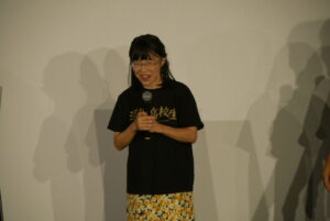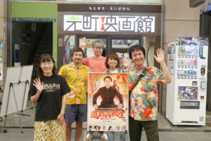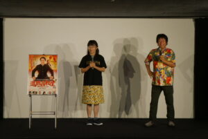 9/6(土)『還暦高校生』の上映後、河崎実監督、長谷摩美さんの舞台挨拶を開催しました。本作は銀座三越の福袋で「500万円で河崎実監督に映画を撮ってもらう」という企画で作られた作品。以前当館でも上映した『メグライオン』も同じ企画で製作され、その時の当選者である長谷さんが主演を務められました。そして今回も6人の応募者の中から見事長谷さんが2度目の当選、そして製作された一本であると河崎監督と長谷さんからご説明がありました。前回の『メグライオン』の撮影の際、長谷さんがひかる一平さんのファンであることから、河崎監督には「次も福袋が当たったらひかる一平さんを相手役に映画を撮ろう!」という話が冗談混じりにあったそうです。まさか次も当選するとは思わず、迷う気持ちもあったそうですが、「神様がわたしにやれと言ってる」という思いもあり、今回ひかる一平さんを主演に迎えての作品となりました。『メグライオン』は4日、今回の『還暦高校生』は3日で撮り終えたことや、ひかる一平さんのサッカーシーンの裏話などお客様のみなさまからの笑いの絶えない舞台挨拶となりました。