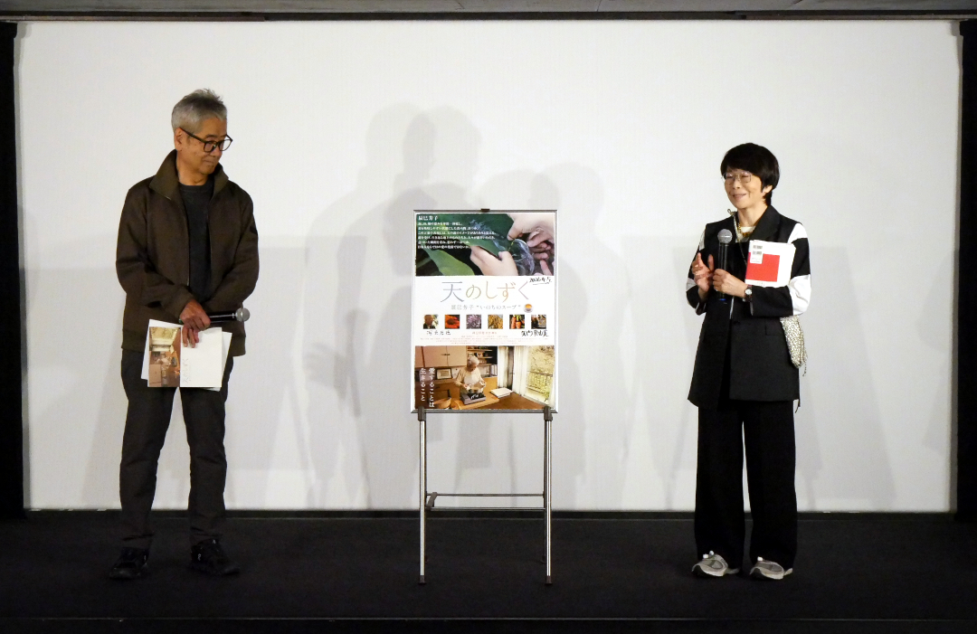 『天のしずく 辰巳芳子“いのちのスープ”』公開2日目に、河邑厚徳監督、矢内真由美プロデューサーの舞台挨拶を開催しました。2012年に映画が完成し、2013年から上映をスタートして以来、さまざまな場所で上映を重ねてきた本作。NHKで番組制作を行ってきた河邑監督は辰巳さんの「スープの湯気の向こうに見える実存的使命」という哲学的な問いを映画の中でいかに表現するかを考え、印象的な冒頭のシーンに込められた意味を解説しながら映画のテーマが「水」であることを語られました。
